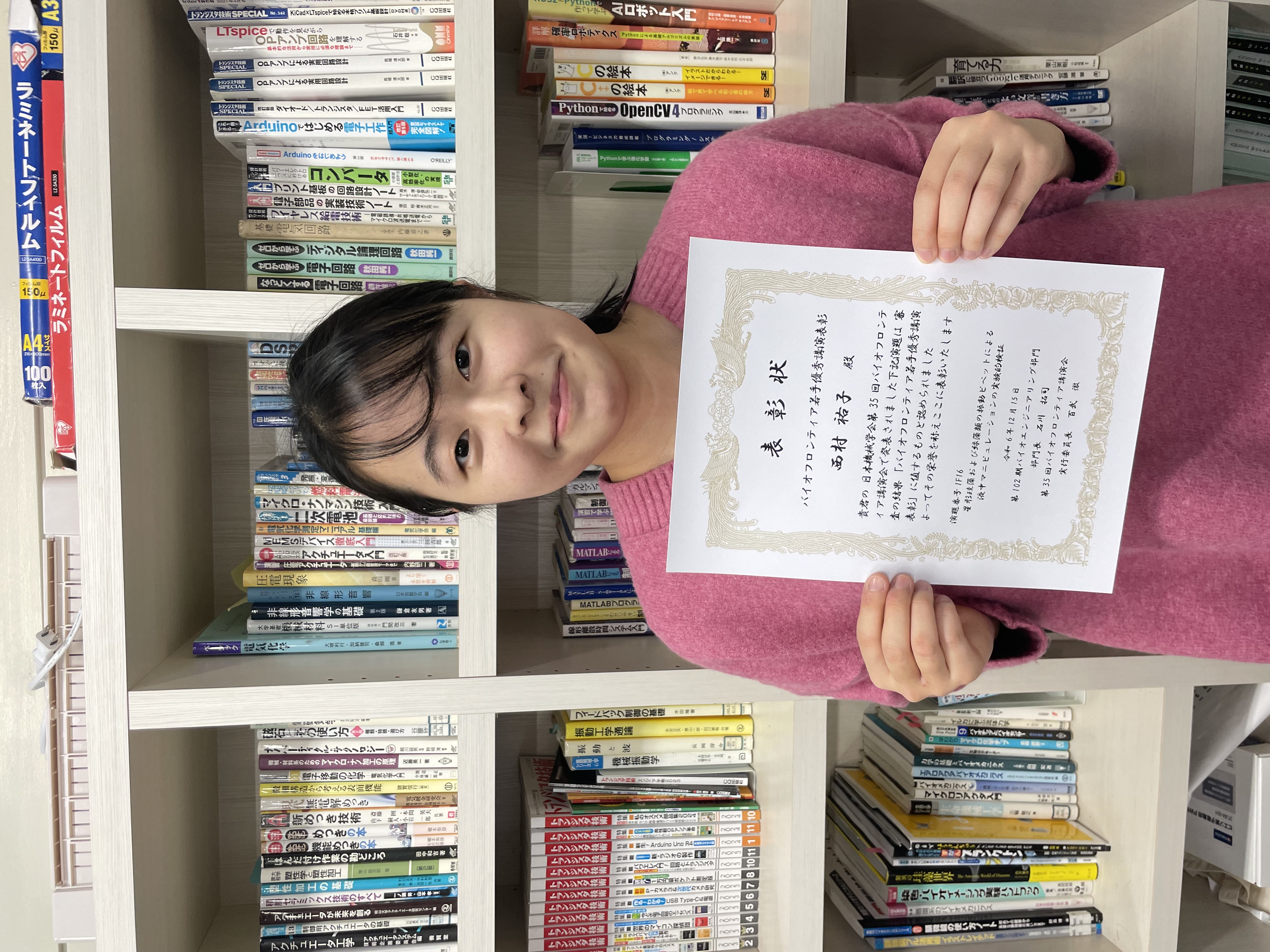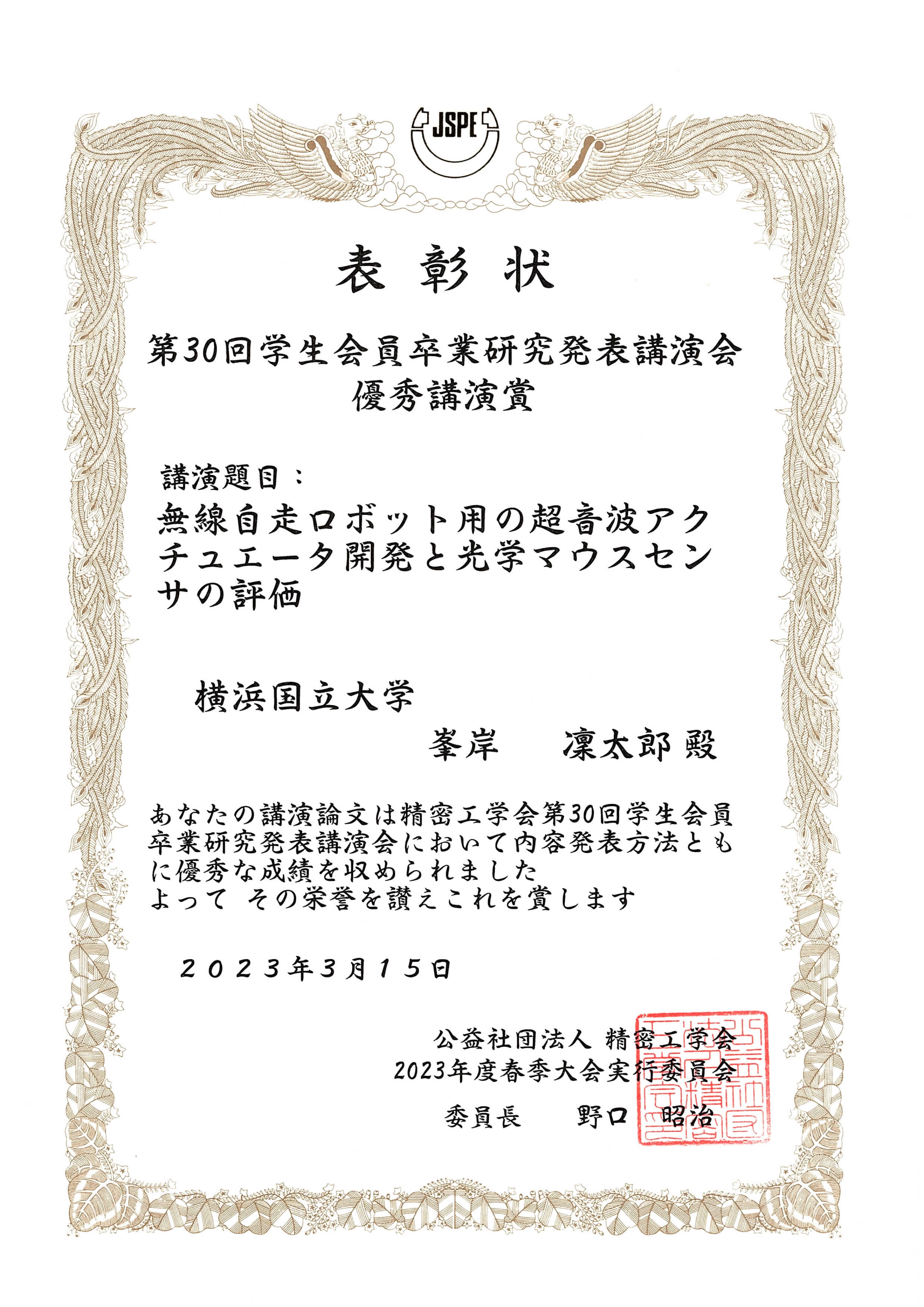 渕脇研B4の峯岸君が精密工学会第30回学生卒業研究発表会優秀講演賞を受賞しました!