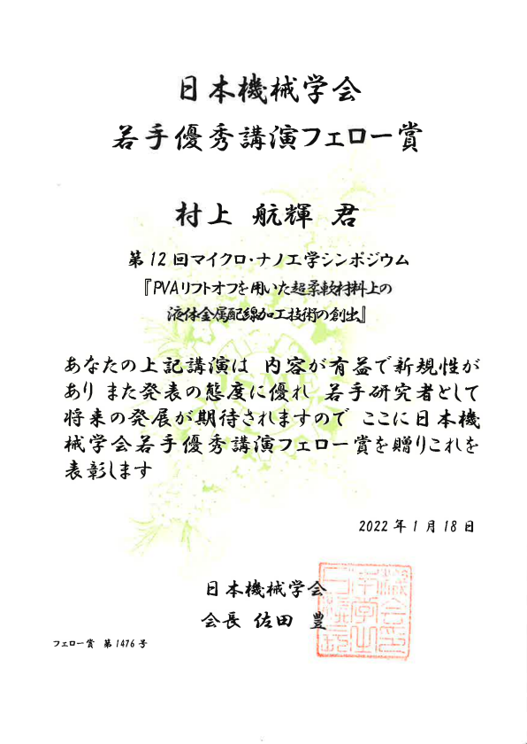 渕脇研M1の村上君が第12回マイクロ・ナノ工学シンポジウムにて若手優秀講演フェロー賞を受賞しました!