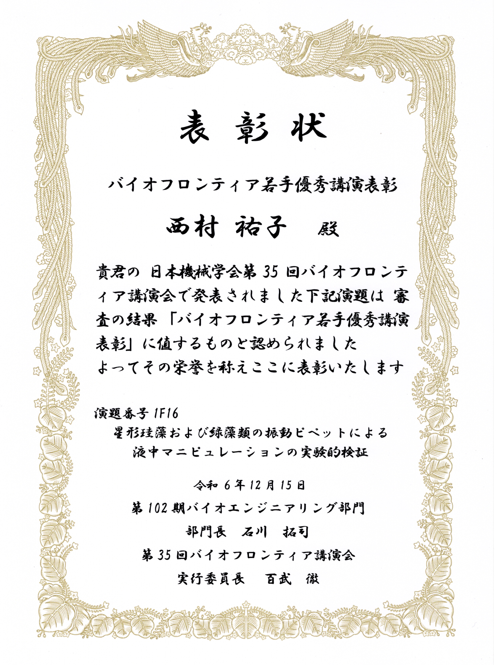 渕脇研M1の西村さんがバイオフロンティア若手優秀講演表彰を受賞しました!