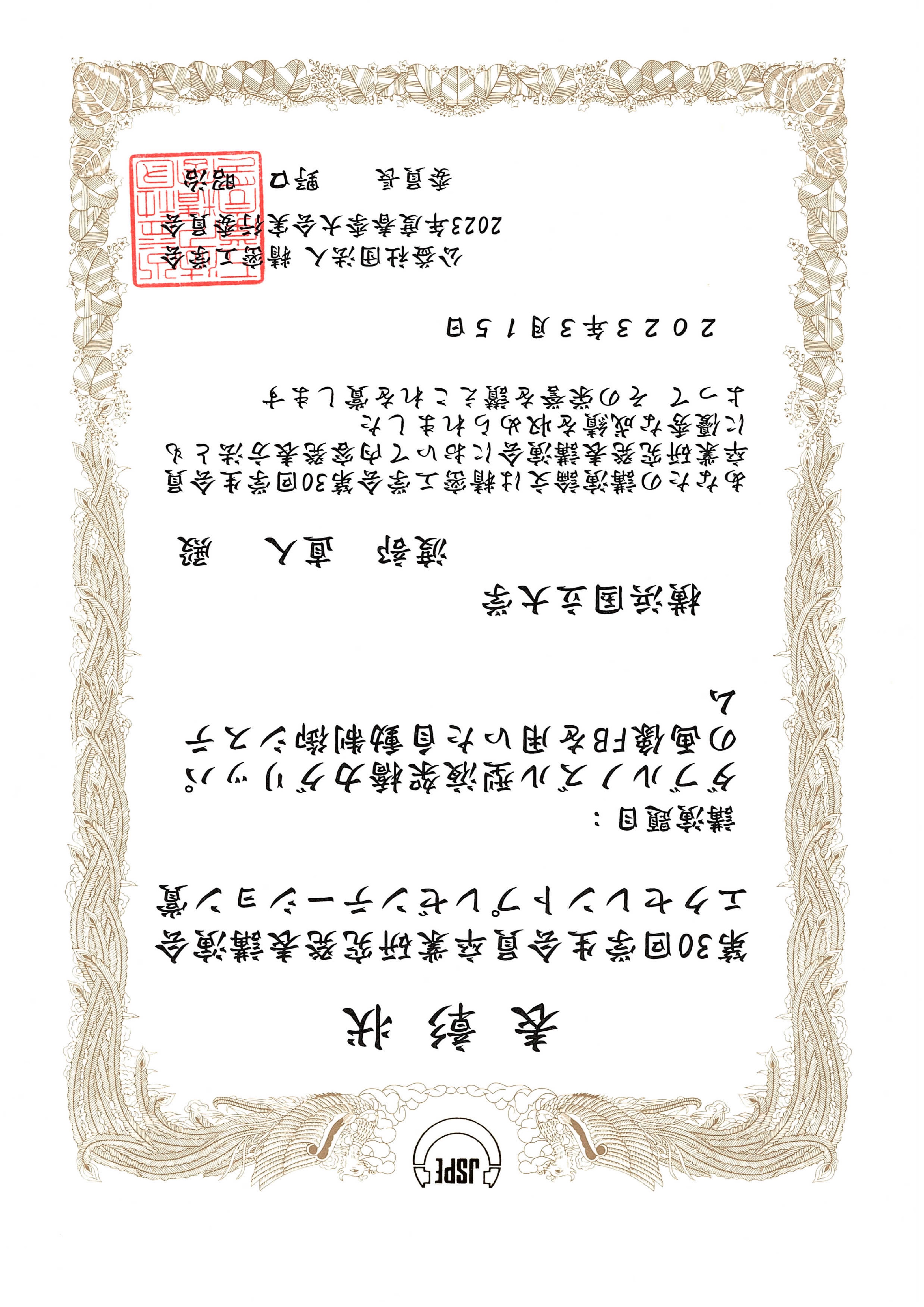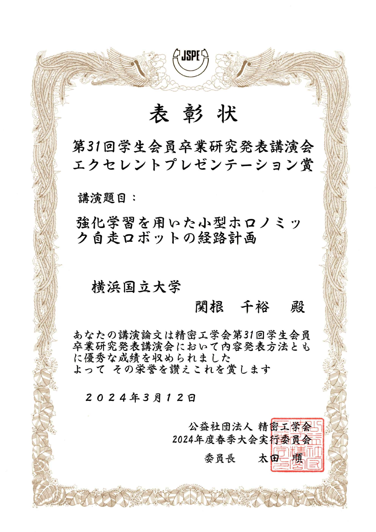 渕脇研B4の関根君が精密工学会第31回学生卒業研究発表会エクセレントプレゼンテーション賞を受賞しました!