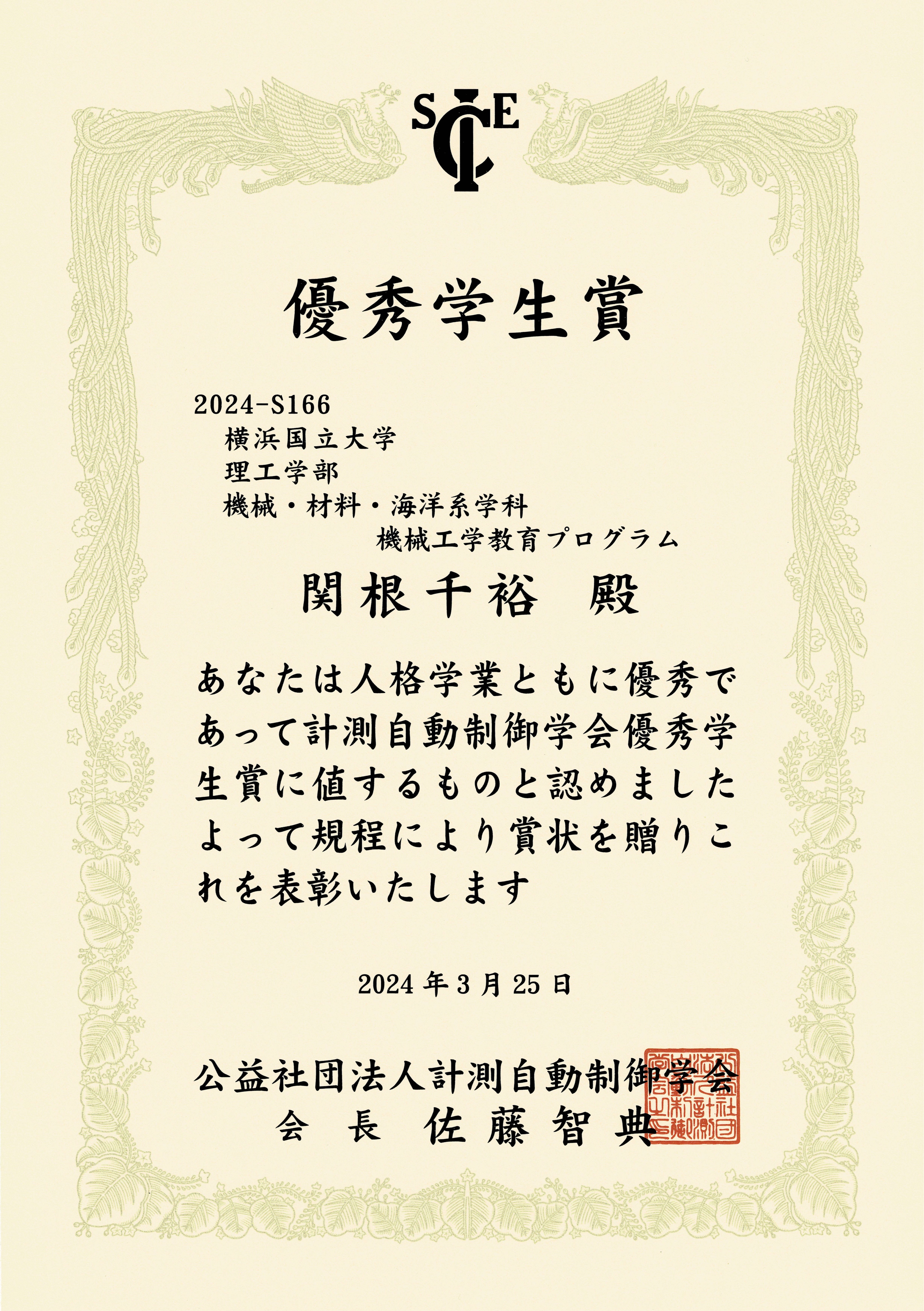 渕脇研B4の関根君が計測自動制御学会優秀学生賞を受賞しました!