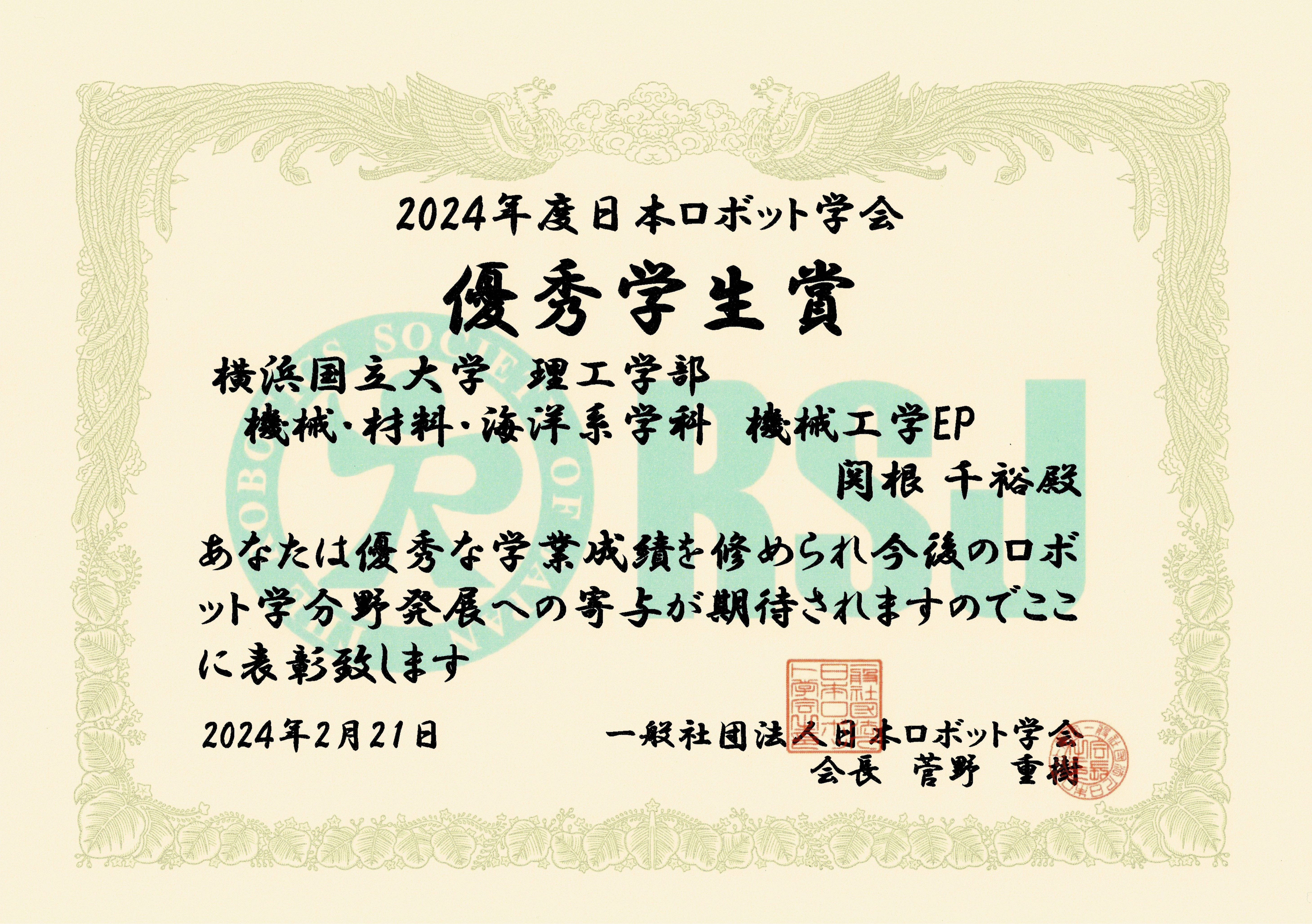 渕脇研B4の関根君が日本ロボット学会優秀学生賞を受賞しました!