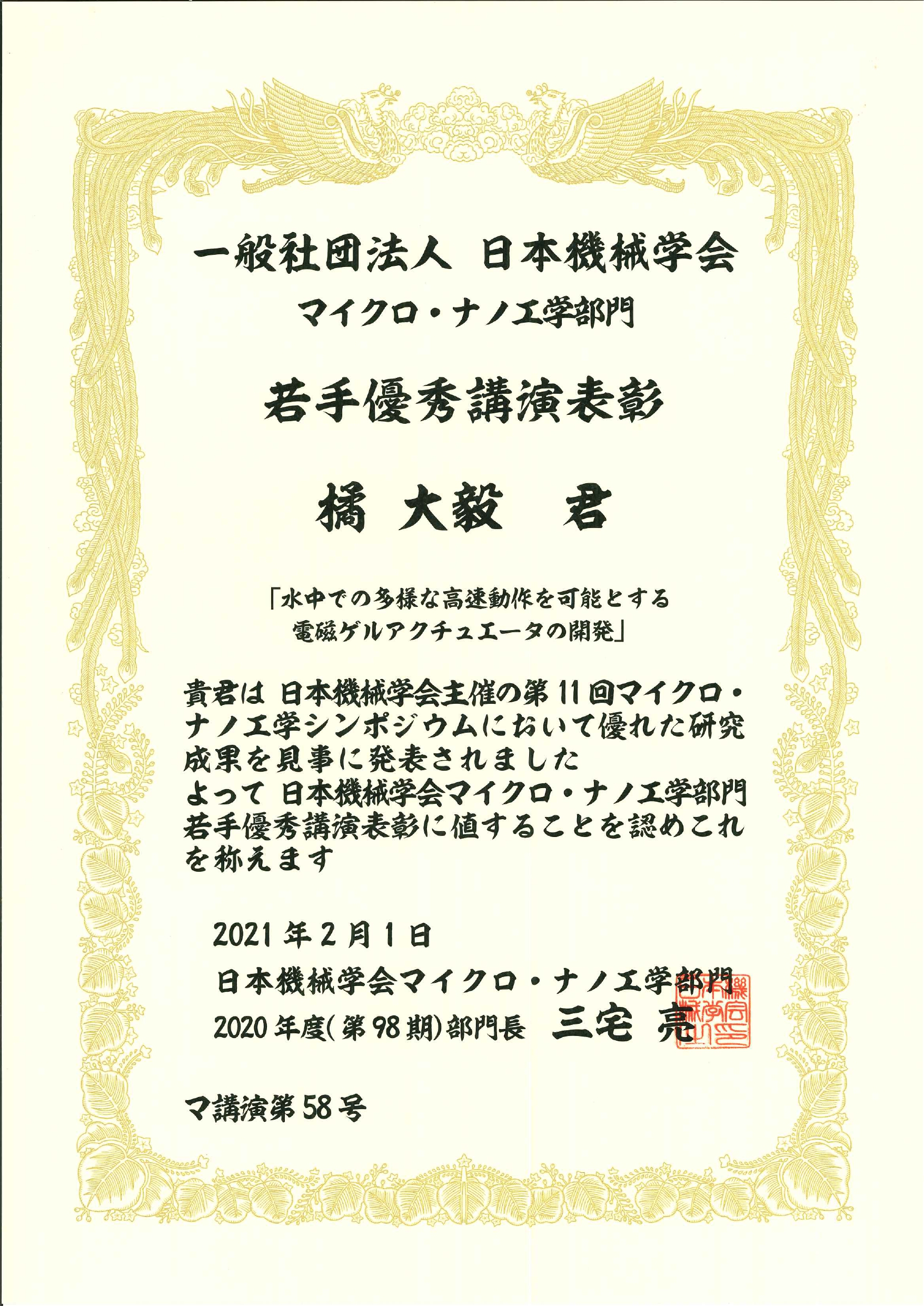 渕脇研M2の橘君が第11回マイクロ・ナノ工学シンポジウムにて若手優秀講演表彰を受賞しました!