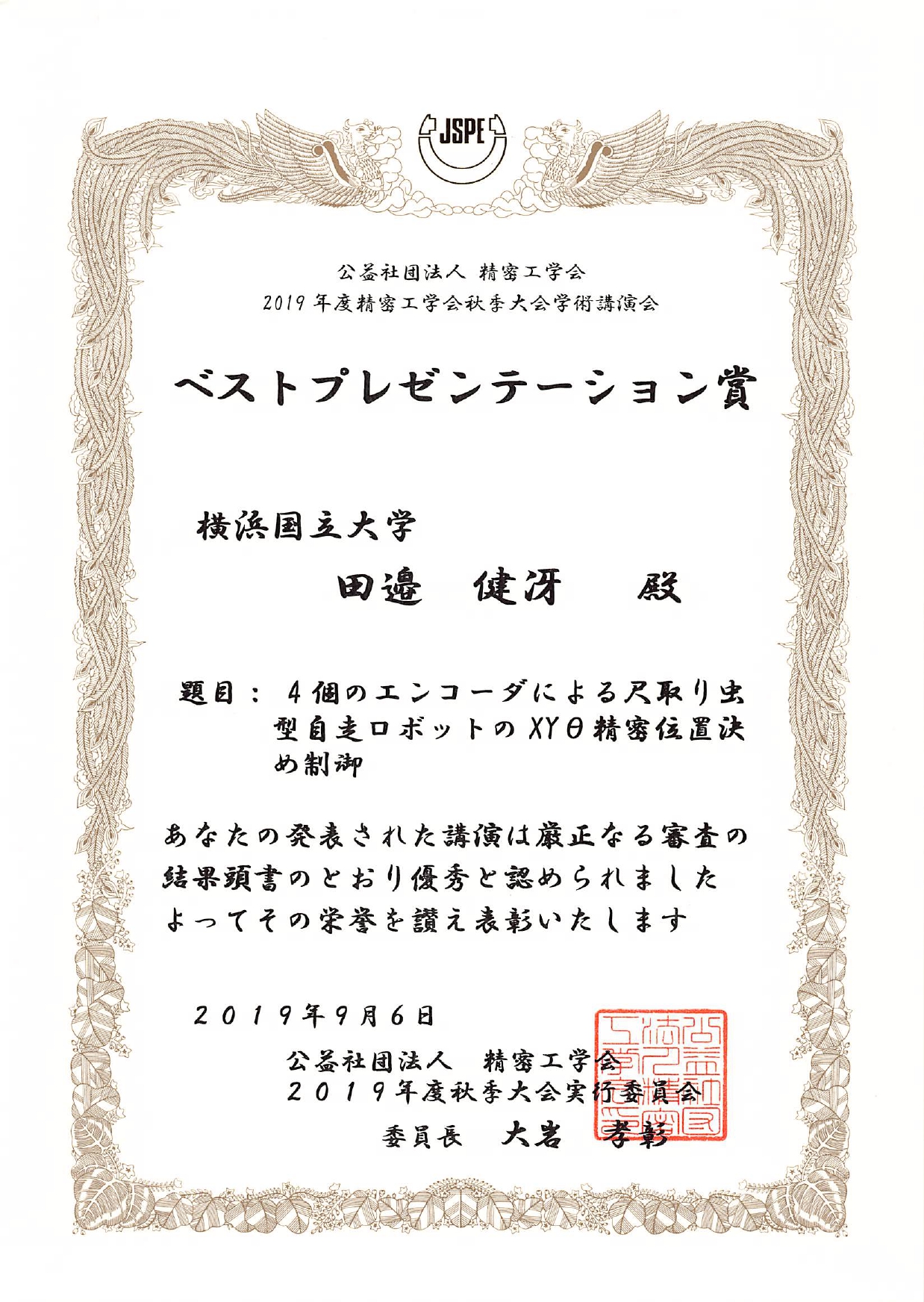 渕脇研B4の田邉君が精密工学会2019年度秋季大会にてベストプレゼンテーション賞を受賞しました!