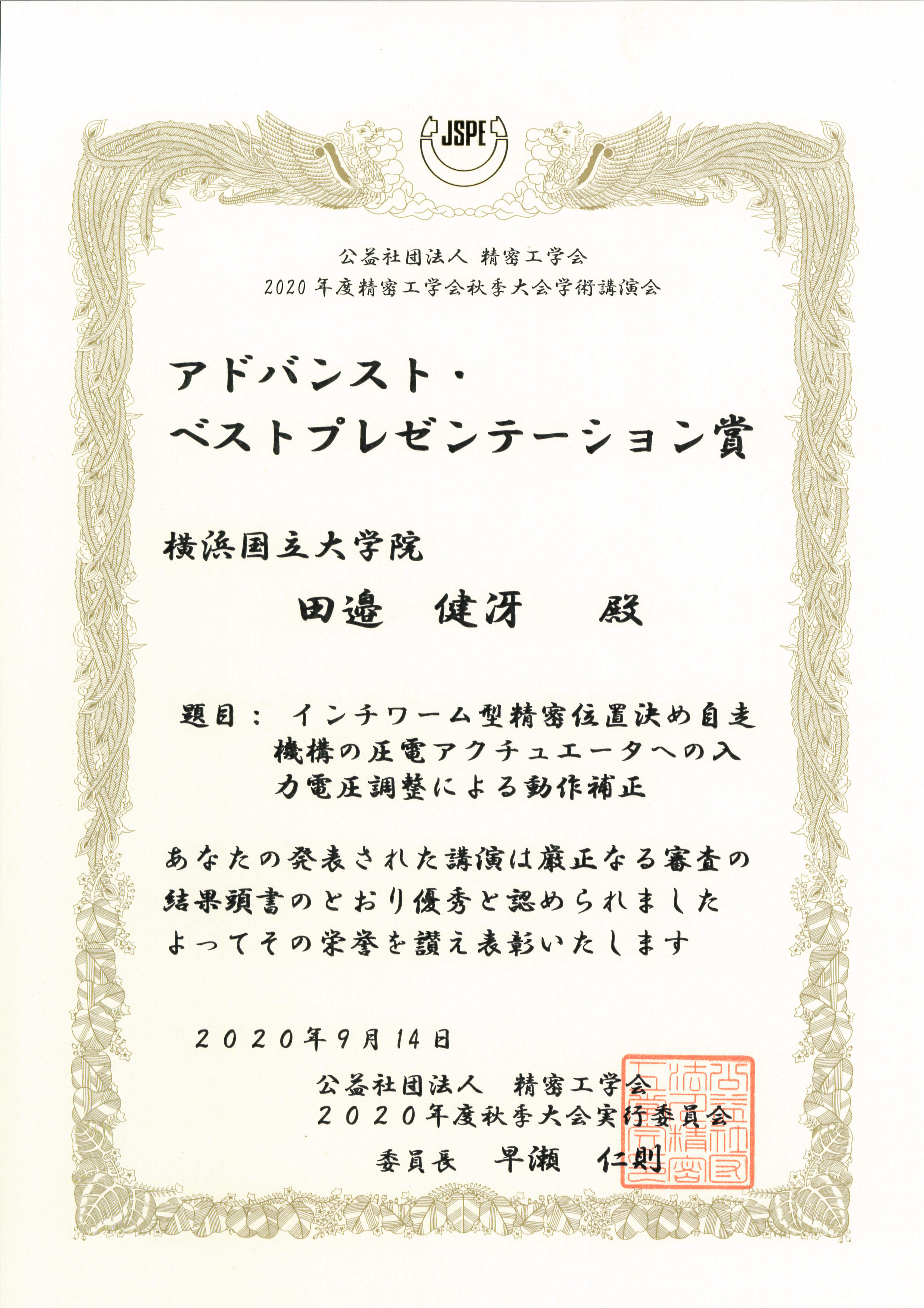渕脇研M1の田邉君が精密工学会2020年度秋季大会にてベストプレゼンテーション賞を受賞しました!