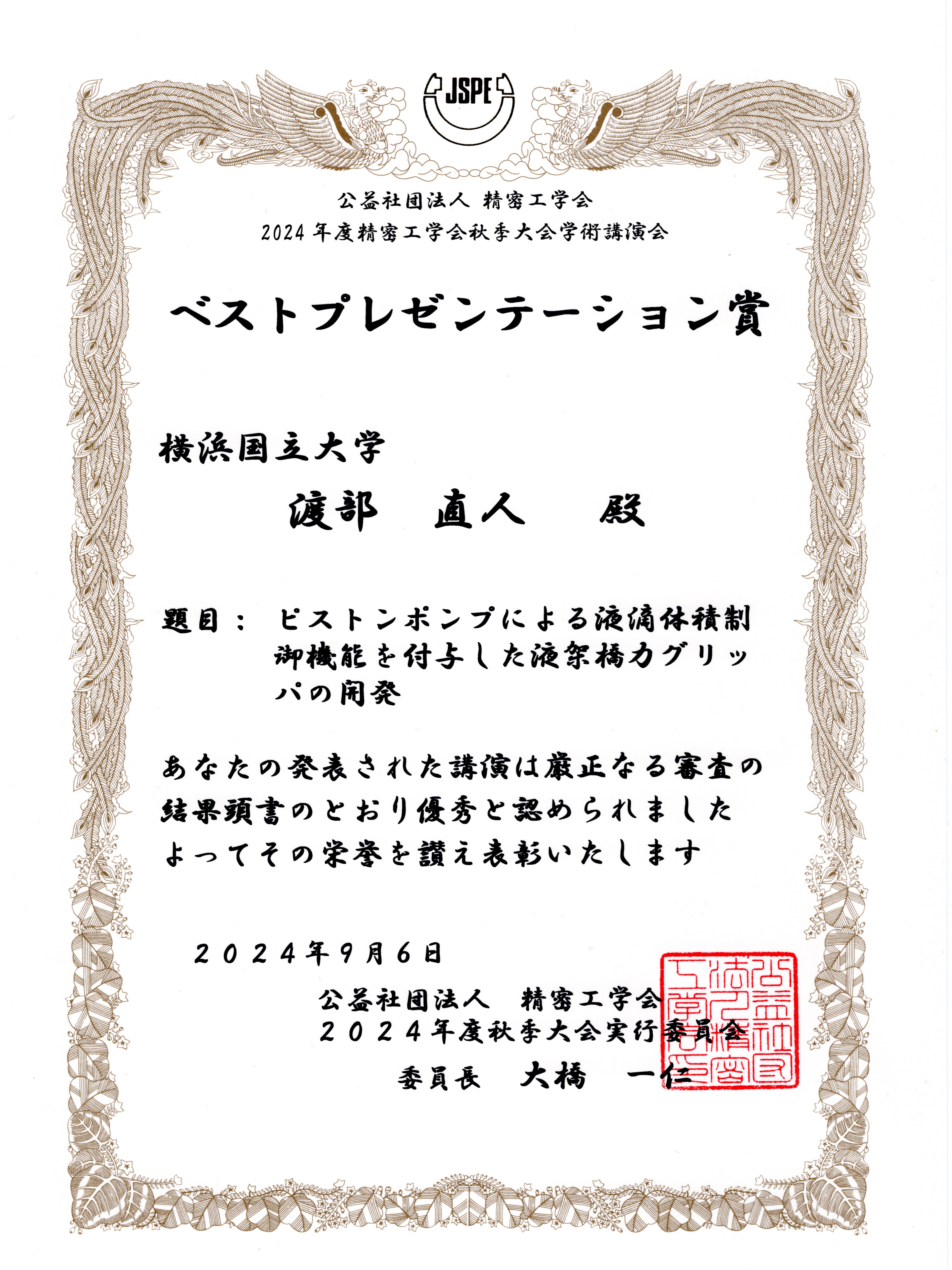 渕脇研M2の渡部君が精密工学会ベストプレゼンテーション賞を受賞しました!