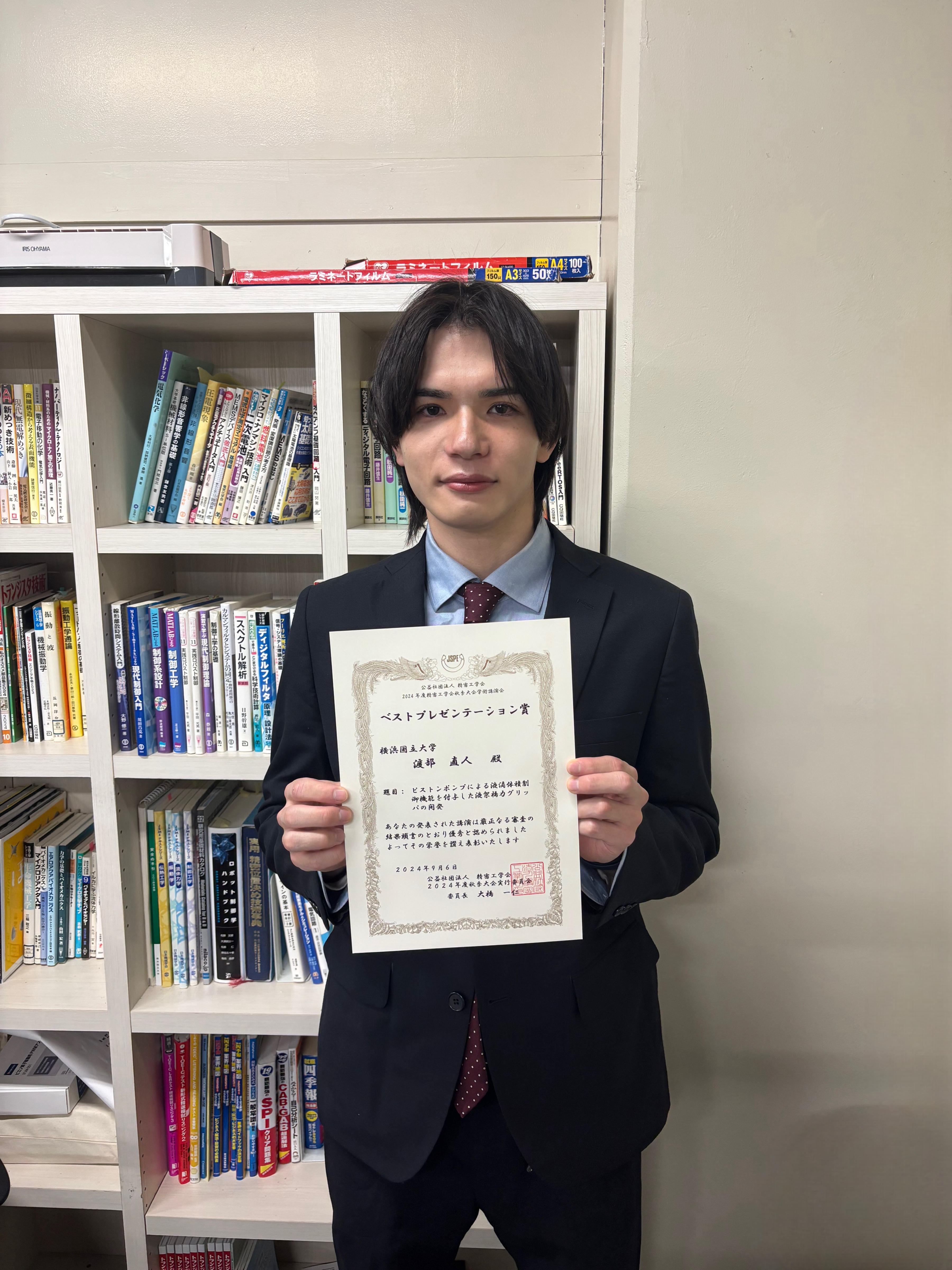渕脇研B4の渡部君が精密工学会第30回学生卒業研究発表会エクセレントプレゼンテーション賞を受賞しました!